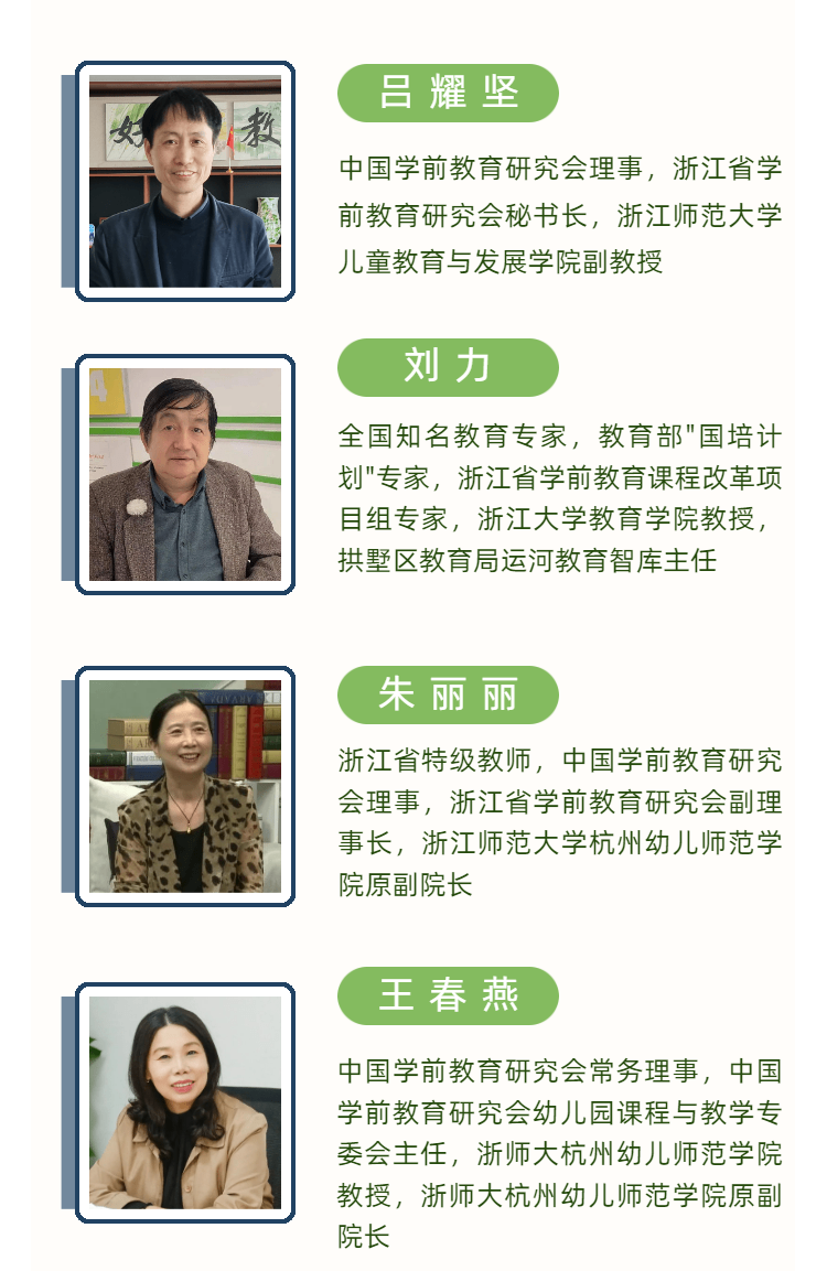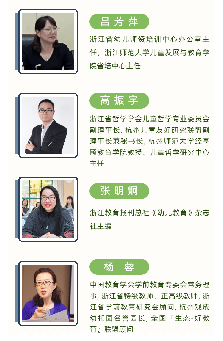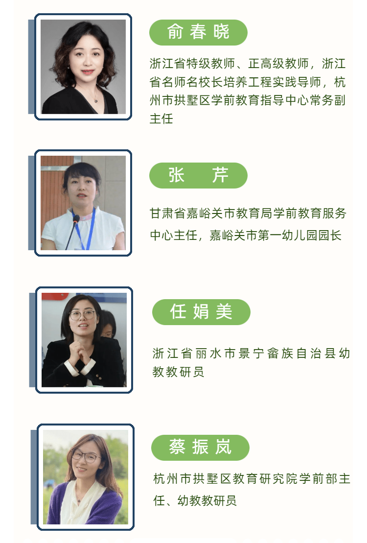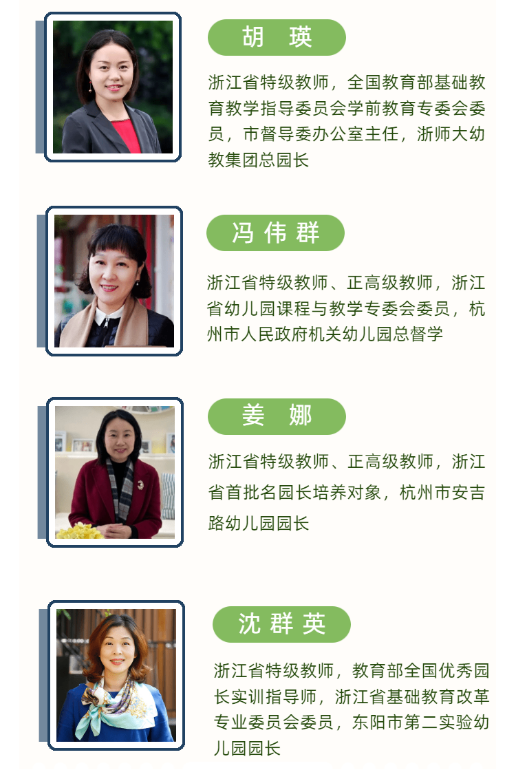 ◇ 浙派学前教育名家、名园长领衔,围绕幼儿园文化与课程建设新样态、托幼一体化、动态备课、师幼互动、家园沟通等专题进行智慧碰撞,观点分享。